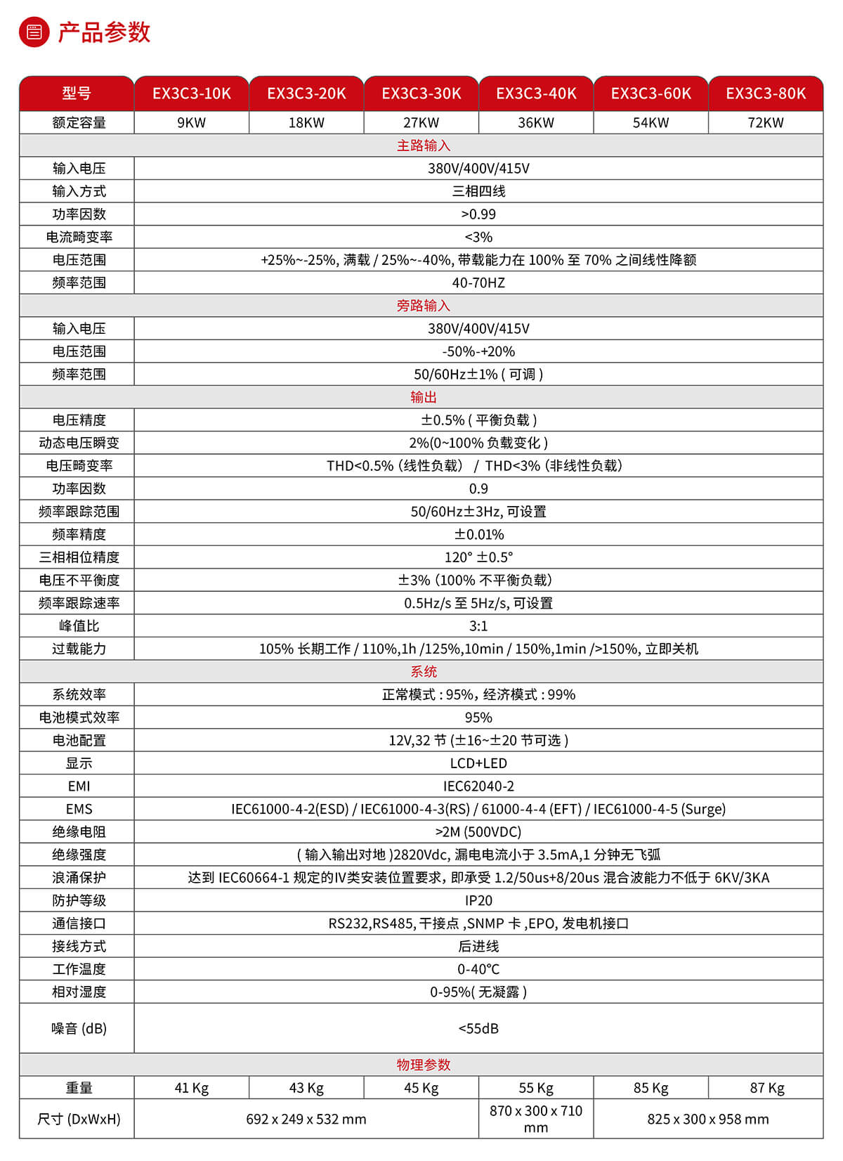 4、三進三出純在線雙變換式產品,支持380/400/415V,50/60Hz 電網體系,提供最合適的供電質量與負載保護;